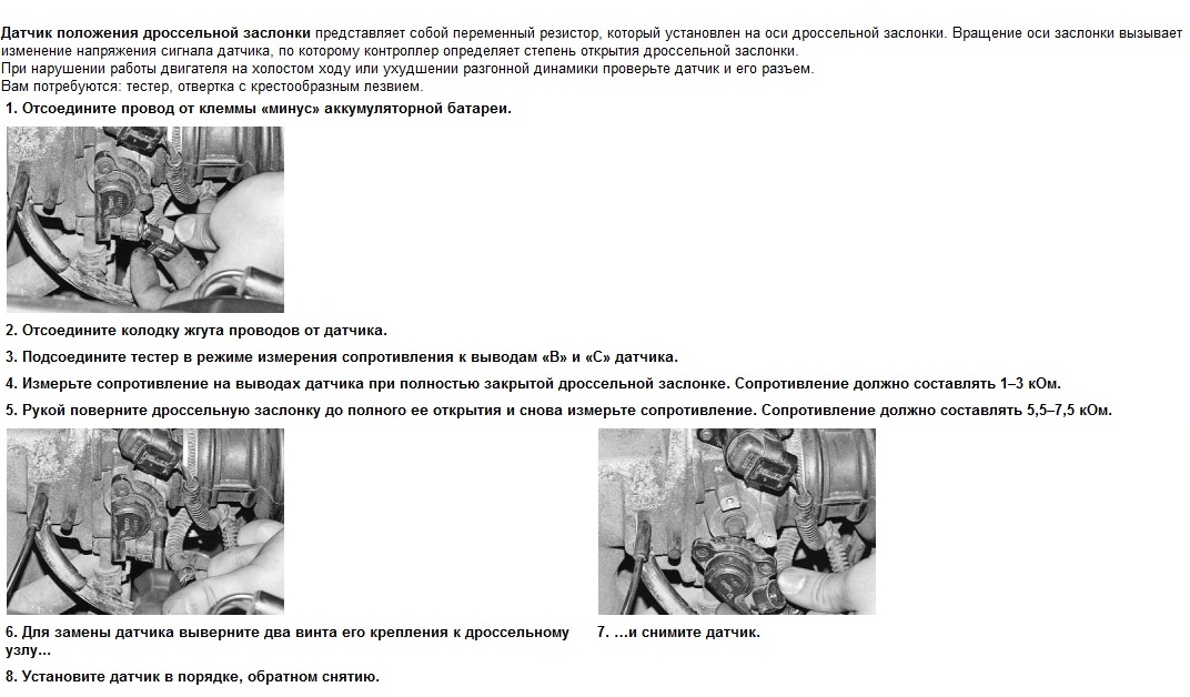 Такая проверка малополезна, по моему. Так можно проверить датчик (по сути - потенциометр) на обрыв. А проблема как раз не в обрыве, а в неравномернсти износа резистивного слоя. Из-за этого напряжение на среднем выводе потенциометра "скачет" при перемещении подвижного контакта, ЭБУ воспринимает это как резкие движения педалью "газа" и соответственно корректирует состав топливной смеси. Получаются "рывки" и нестабильный ХХ. Сообщение отредактировал nac67 - 11.11.2011, 20:42 |
