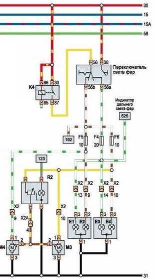 Пропал дальний свет, кто знает подскажите где что смотреть,(предохранитель целый) Для начала пробуем поморгать: 1. если моргает то проверяем реле К4 и контакты подрулевого переключателя фар 56-56а; 2. если не моргает то проверяем предохранитель F4 и разьем Х2 и также контакт 56а на подрулевом переключателе фар. -------------------- Кто сказал что электрик не воин света? Он всегда на щите или под щитом.