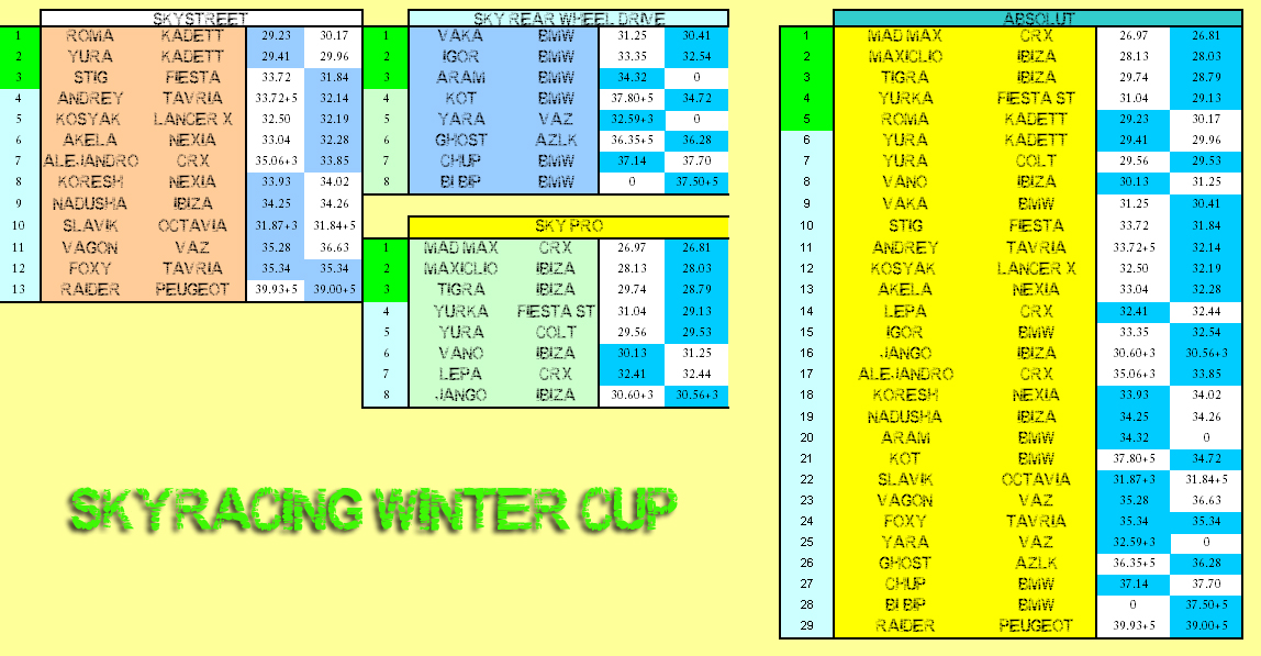 Отже, Кубок буде проходити у 5 етапів. Захід планується не тільки на паркінгу ВДНГ. Вас чекають видовищні заїзди, цікаві траси та гарна атмосфера нічних перегонів. Так, перший етап кубку відбудеться 4 грудня, на паркінгу ВДНГ, що на Голосіївщині. Початок, як завжди о 23:30. Реєстрація починається з 22:00 Плата за в'їзд для глядачів: 15 грн. з автівки Вартість участі у кожному етапі: 50 грн. На останньому тренуванні та на першому етапі, триватимуть збори дитячих іграшок, речей та коштів для дитячих будинків!!! Цитата Регламент "SkyRacing Winter Cup" 1. Кубок складається із 5-ти етапів. Перший етап відбудеться 04 грудня 2009 року. 2. В день проведення кожного з етапів, учасник повинен з'явитися для реєстраціі та підтвердження участі до 22-30 та заповнити анкету. 3. Організатори мають право відмовити у реєстрації без повідомлення причин. 4. Присвоєння стартових номерів відповідає порядку реєстраціі учасників. 5. Машина допускається на стоянку для учасників після проходження технічного огляду організаторами, а саме: А. перевірка гальмівної системи Б. наявність пасків безпеки (якщо заводом-виробником вони передбачені) В. стан шин. 6. Автомобілі учасників змагань розміщуються на стоянці згідно вказівок організаторів змагань. 7. Автомобілі поділені на наступні залікові групи: - Автомобілі з приводом на передню вісь (SkyStreet) - Автомобілі з приводом на передню вісь(SkyPro) - Автомобілі з приводом на задню вісь - Автомобілі з повним приводом - Sky Girls 8. Змагання по кожній групі проводяться, якщо в групі є хоча б 3 учасники. 9. Учасник має: один ознайомлюваний проїзд по карті та 2 спроби, що будуть фіксуватися. Найкраща спроба буде занесена до результату. 10. Фініш заїзду – база автомобіля 11. При порушенні правил проїзду, до учасника застосовується така система штрафів: - за дотик або збитий конус (маркер) – додається 3 секунди до часу проходження - за фальшстарт додається 3 секунди до часу проходження - за відсутність фінішу базою додається 5 секунд до часу проходження - проходження дистанції з порушенням схеми –незалік 12. Учасники будуть розподілені до таблиці згідно їх залікового часу. Для вирахування переможців усіх етапів, кожний кращий заліковий час додається з кожного етапу. 13. За результатами 5-ти етапів, будуть оголошені переможці по кожному із класів. Перші три переможця у кожному класі, будуть нагороджені цінними призами. Усі призери будуть нагороджені медалями та пам’ятними грамотами. 14. Реєстраційний внесок: 50 грн. за кожний етап. www.skyracing.com.ua Это будет незабываемо. С ув. команда Sky Racing -------------------- |