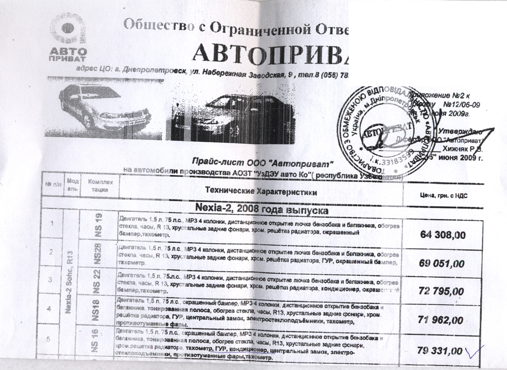 Остались ли официалы? Или только через АвтоПриват? Дилеры АвтоПривата предлагают авто 2008г.в. на 2000 - 4000 грн. дороже офиц. прайса http://www.uz-daewoo.com.ua/nexia/prices.html -------------------- |