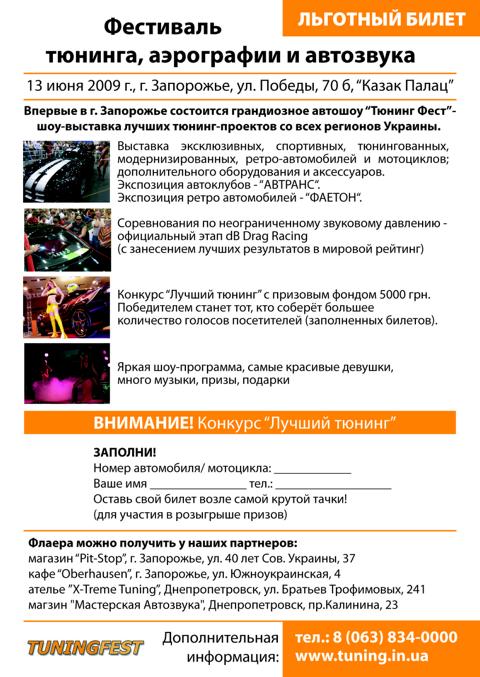 13-14 июня 2009 г. в г. Запорожье будет проходить “TuningFest“ - фестиваль по тюнингу, рейсингу, аэрографии и автозвуку.