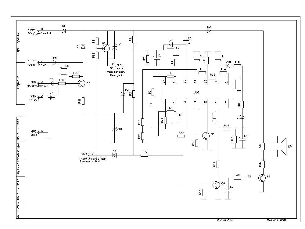 ... 2.1) На место диода D5 устанавливается перемычка. ... При включеных габаритах и выключеном зажигании открываем водительскую дверь и срабатывает предупреждающий зумер. При закорачивании D5 зумер будет работать при откривании любой двери. -------------------- Кто сказал что электрик не воин света? Он всегда на щите или под щитом.