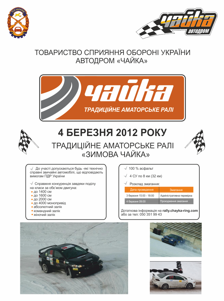 Если участников меньше 60 тогда, 4 СУ по 7,5 км, 30 км соревновательной дистанции, 100% асфальт, 2 проезда в одну сторону, 2 в обратную Если участников больше 60 тогда, 3 СУ по 7,5 км, 22,5 км соревновательной дистанции 100% асфальт, 2 проезда в одну сторону, 1 в обратную Программе соревнования: 9:30-10:00 - ознакомление с трассой ралли 1 (направление А) 10:00-10:30 - ознакомление с трассой ралли 2 (направление Б) 10:30 - 11:30 - медицинская проверка (согласно расписания по номерам бортов) 10:45 - публикация предварительной стартовой ведомости (с пометкой, что экипажи без отметки мед контроля не допускаются к старту) 11:00 старт первого автомобиля 16:15 публикация предварительных результатов 17:00 награждение Стоимость участия для членов клуба: -- предварительная регистрация и оплата до 21 марта - 500 грн -- предварительная регистрация и оплата до 23 марта - 600 грн -- регистрация во время административной проверки - 700 грн Стоимость участия: -- предварительная регистрация и оплата до 21 марта - 600 грн -- предварительная регистрация и оплата до 23 марта - 700 грн -- регистрация во время административной проверки - 800 грн Участие женского экипажа - бесплатно!) Заявку отправлять на info@chayka-ring.com информация 050 351 99 43 Сообщение отредактировал Автодром Чайка - 16.3.2012, 10:07