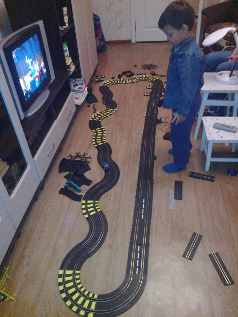 Были в гостях у бабушки, достал забытую гоночную дорогу, куплена была еще для старшего сына 10лет назад.
