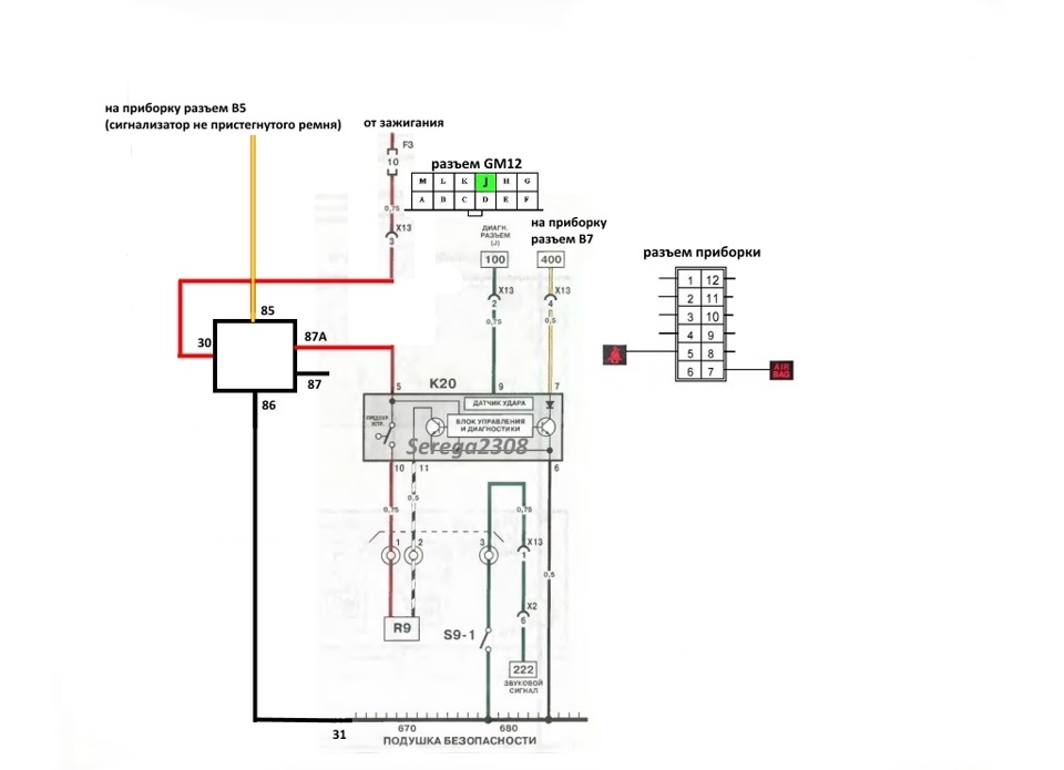 Сегодня подключил реле на блок подушки. Теперь при не пристегнутом ремне подушка не сработает. Лампа AIR BAG при этом горит, пристегнулся - потухла, подушка в активном режиме.