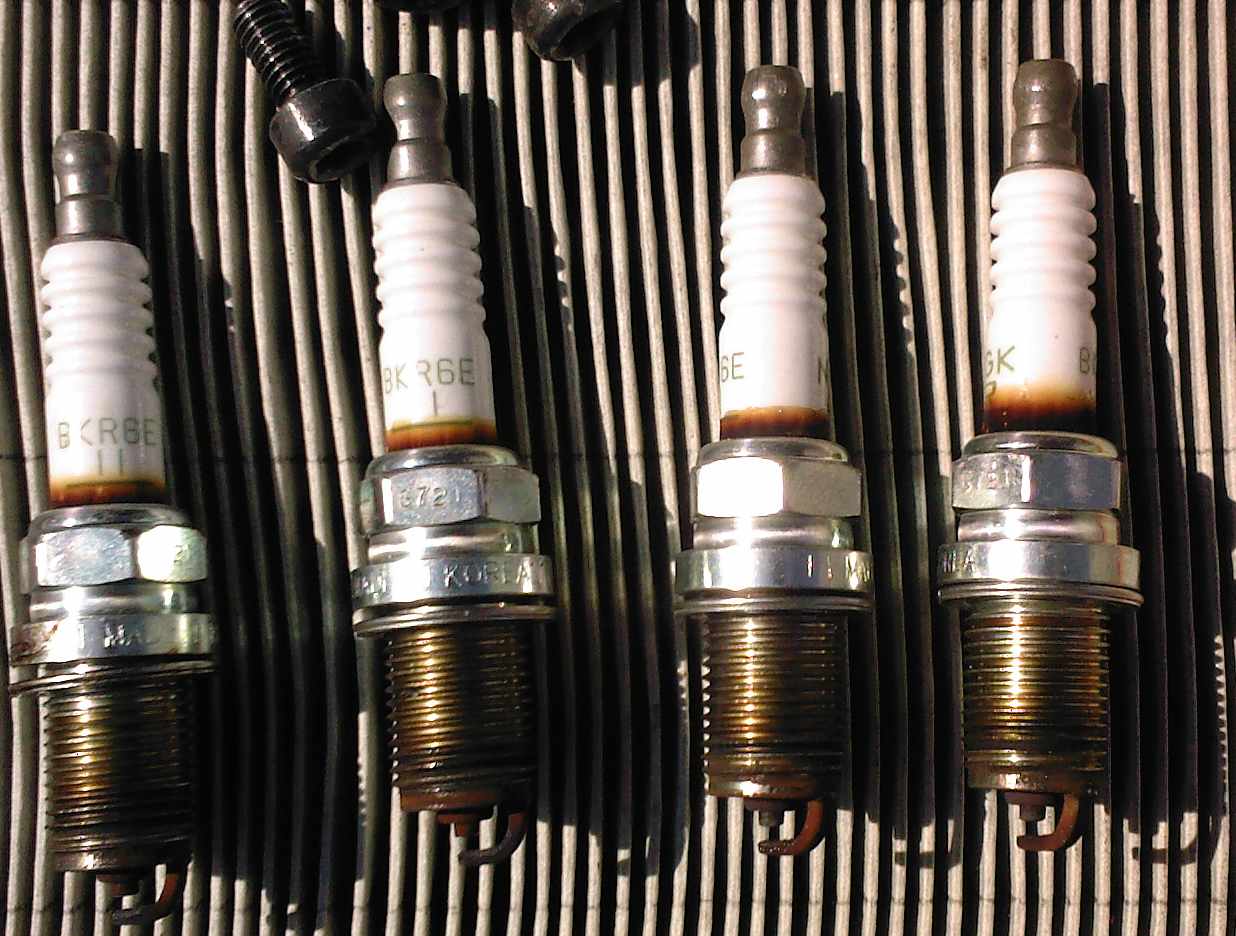 Поменял родные свечи на Бош (20 тыс. км). На фотках родные свечи и двигатель, вид сверху. Маслянистое пятно было именно возле той свечи у которой налет на керамике выше чем у остальных. Имхо на свечах следы от присадок в бензине