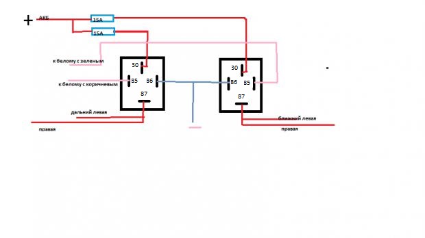 Схему включения реле в студию! У меня сделано по такой схеме.Можно в разрыв проводов на каждую фару поставить предохранитель. -------------------- Всем все прощаю, пока не придумаю, как отомстить...