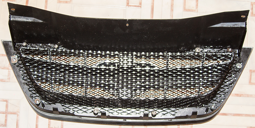 Вставил и я себе сетку в решетку радиатора. Пластина алюминиевой окрашенной в черное сетки на Перова 60 грн. Наложил сетку на снятую решетку изнутри, вырезал по форме с нужным припуском, обогнул по рельефу. Режется обычными савецкими канцелярскими ножницами, почти как картонка. Закрепил изнутри на 10 родных винтов, котрые соединяют части пластика решетки, по контуру. Под шляпки винтов положил широкие шайбы, чтобы головки винтов не проваливались в ячейки сетки. Встала на место как родная.