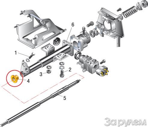 Мнение (NexD) После покупки был не совсем удовлетворен мощностью ГУРа. Руль был туговат. А сейчас, когда на одометре 17000 вдруг стало прихватывать руль. Неожиданно выяснил, что если приложить изгибающий момент на баранку (точка "12 часов" от себя, точка "6 часов" на себя) - все приходит в норму. Налицо перекос вала относительно колонки. Известная пластиковая втулка болтается где-то внизу, вал где-то сверху трется об колонку. Отрегулировал колонку. Руль стал намного легче, чем с новья. ДЕЛАЮ ВЫВОД: На заводе просто скрутили все без центровки.( Как устранить характерный дефект "Нексии" - сползание пластиковой направляющей втулки на валу рулевого колеса? Мнение (ЗР) Данная деталь технологическая и служит контрольной оправкой при сборке рулевой колонки. Ее назначение - центровка рулевого вала относительно кожуха колонки. При сползании следует снова установить втулку на посадочное место. Если она не входит в кожух рулевой колонки, это свидетельствует о нарушении центровки рулевого вала, а значит, ее нужно восстановить. Работу следует выполнять следующим образом: ослабить болт 1; открутить болт 2; открутить гайку 3; произвести центровку кожуха 6 относительно рулевого вала 5 перемещением вверх-вниз, вправо-влево; проверить правильность центровки пластиковой втулки 4; закрутить гайку 3 и болты 1, 2. Источник: WWW.ZR.RU - автомобильный журнал "За рулем". |