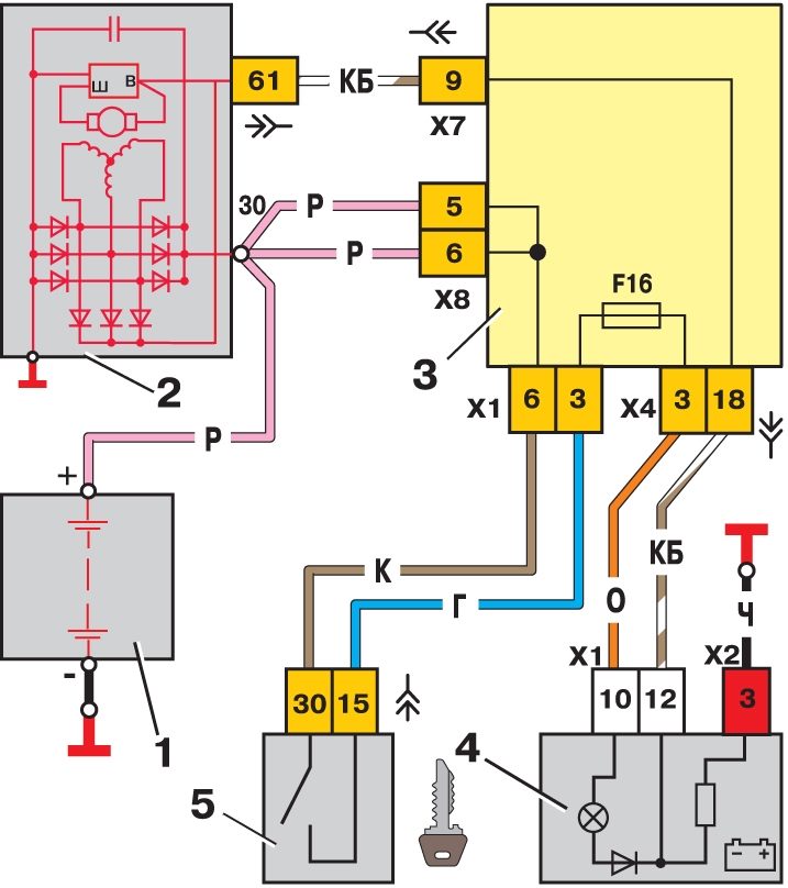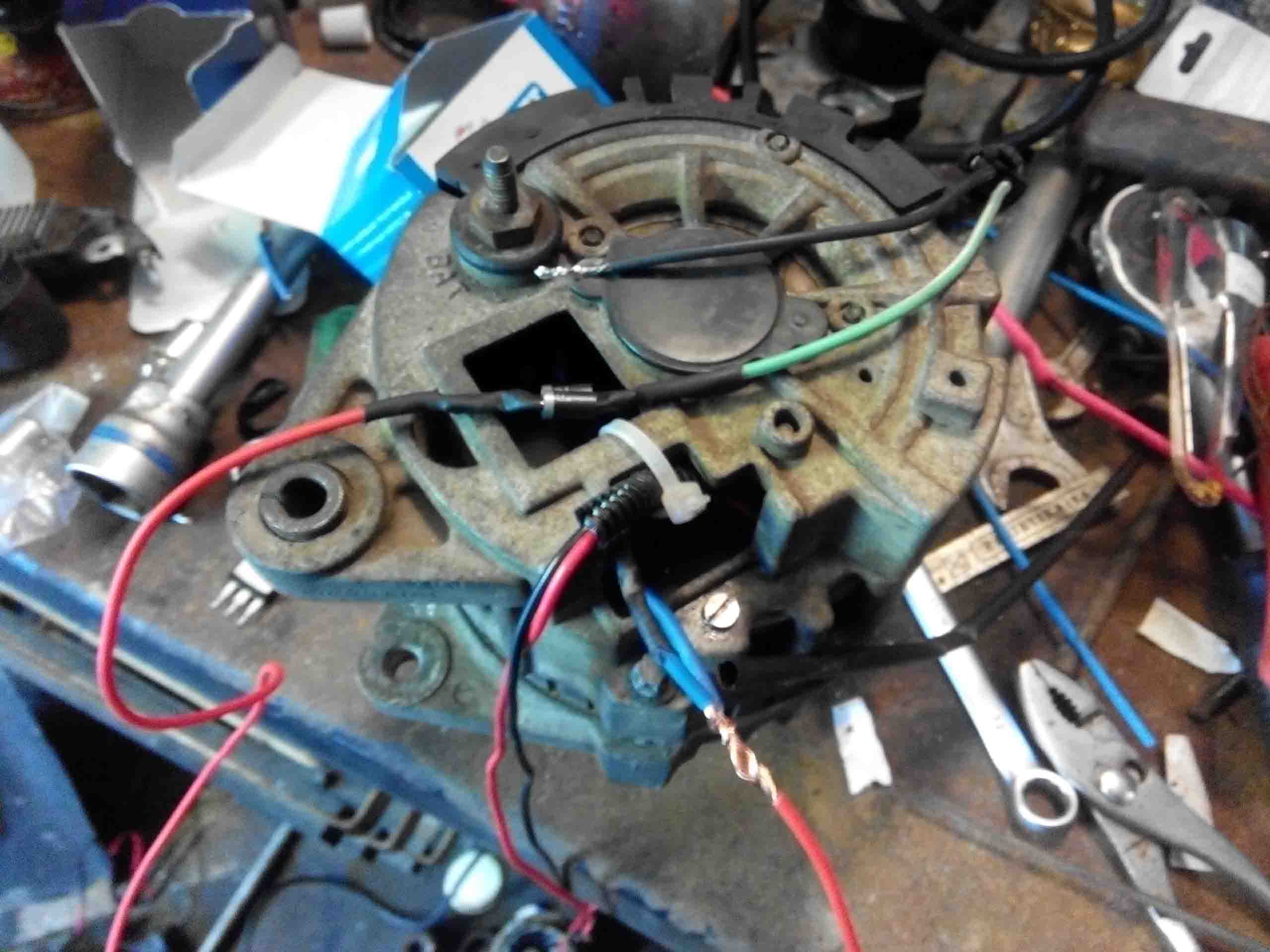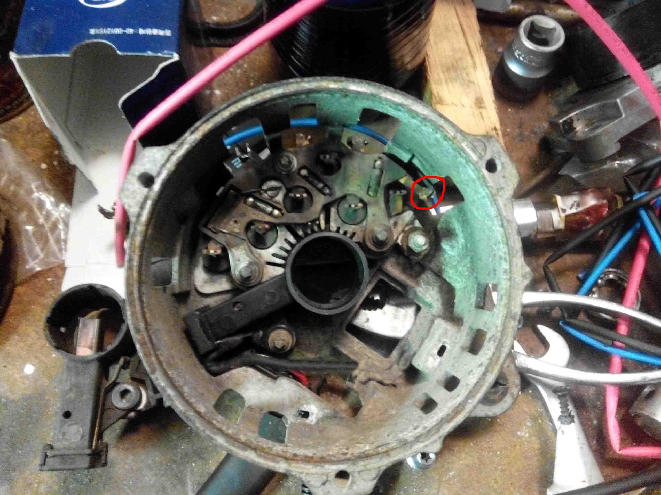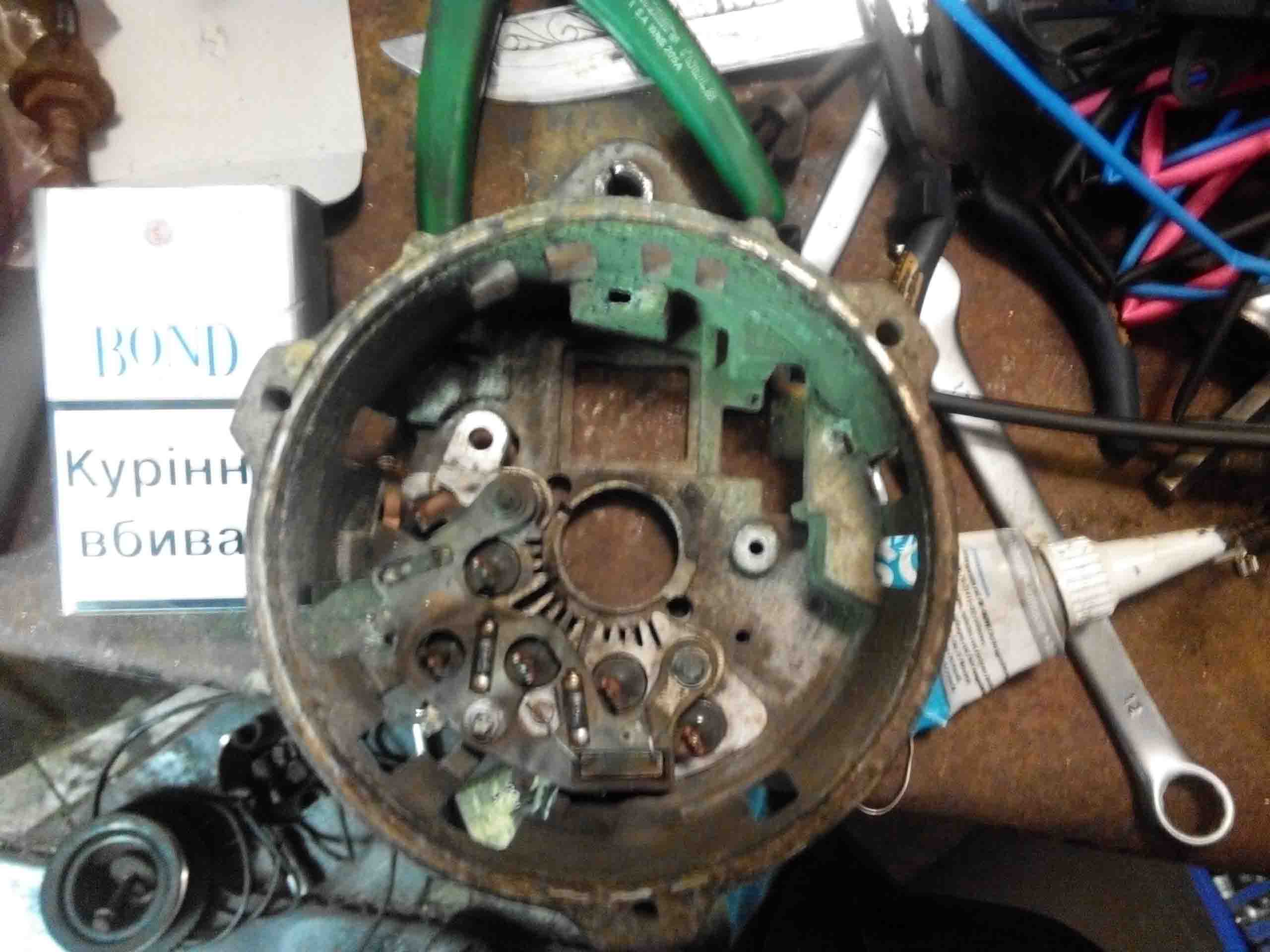 Процедуру разборки генератора описывать не буду (в инете полно). Приобрел на аукро вот такой регулятор: (сразу сори за качество, снимал на телефон без вспышки в гараже) , а также на рынке щеткодержатель со щетками и стал думать как это приспособить в нашего гену... Пришел к выводу, что нужно повторить вот эту схему от Ваза, но с нашими нуждами. (нашел в инете- людям спс) Сразу задался вопросом, что за резистор и диод по схеме, забегая наперед скажу, что резистор около 50 Ом 5W (можно больше номинал если такой не найдете, но не сильно), диод любой на прямой ток не менее 3х ампер и обратное напряжение вольт 100 (я использовал при экпериментальной пределке два FR502 в параллель). А теперь понеслась.... В нашем генераторе используется схеме возбуждения с постоянным "-", т.е одна щетка сидит на минусе. У ваза- с постоянным (если можно так сказать) "+", и посредством ШИМ (если не знаем что это такое- лезем в инет и не флудим здесь) "притягивается" на землю. Этот принцип работы и принимаем за основу для пределки. Чтоб не возникло вопросов, почему на схеме у регулятора три "провода", а по факту 2, то скажу, что прочитав инструкцию к нему- поймете, "третий провод" это масса регулятора, он же и теплоотвод. Для начала извлекаем из генератора щеточный узел и реле-регулятор, получаем и Затем откусываем "лишнее" у контактов щеткодержателя и облуживаем их с последующей подпайкой и выведением проводов наружу из генератора. Также нам нужно вывести провод наружу от дополнительной тройки диодов (обведено красным), внутри изоляционную ленту не рекомендую применять, запаситесь термоусадкой разного диаметра, она меньше боится высоких температур. Теперь можно собрать генератор и продолжить коммутацию снаружи (или как фантазия пожелает), далее просто описание действий... Под машиной на гену идет два провода- белый и красно-белый, белый это на лампочку на панели приборов а красно-белый эт плюс при зажигании из блока предохранителей. Подключаемся к нему и выводим провод наверх (я поставил разьем для удобства), родной разъем резать не стал- просто упаковал в изоляцию. Гофру от регулятора я заменил гофрой большего диаметра и по факту там проходит 4ре провода. Один наверх плюс при зажигании (с разъемом), второй вниз от лампочки с диодом и два на регулятор. Резистор пока не устанавливал, но собираюсь, он нужен на случай выхода регулятора из строя (то есть пробоя ключевого транзистора на землю и возбуждения "в полный рост" (вольт до 18) и как следствие выжигание незащищенной электроники в авто), он ограничит возбуждение путем просадки на землю напряжения из тройки диодов, а также обеспечит более достоверную индикацию наличия зарядки. Вот еще промежуточная фотка Видно диоды и габаритную лампочку. Позже выяснил что достаточно и лампочки такой как в приборке у нас, но что было под рукой Из личного опыта скажу, что если проигнорируете диод и лампочку, то ничего страшного не произойдет, вы просто не сможете заглушить машину Вот "временный" вид законченной конструкции Видно и регулятор и лампочку. Позже выложу видео работы, но пока опишу... Включаем зажигание, лампочка горит ярко. Заводим мотор- лампа гаснет. Смотрим на бортовик (регулятор ща посередине стоит на положении 14,2)- при температуре на улице +5, напряжение СРАЗУ псоле запуска-14,4, после полного прогрева, а как следствие и прогрев подкапотного про