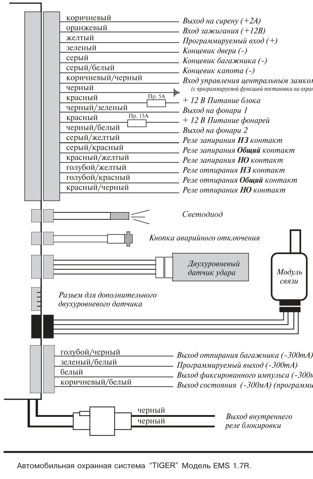 Всем доброго времени суток! Дорогие форумчане, помогите мне разобраться в сигнализации. Купил нексию 2008г.в. рестайлинговая сначала не обращал внимания ,а потом решил проверить сигнализацию и тут началась головная боль)))центральный замок работает нормально , когда при установке на сигнализацию открываешь дверь ничего не происходит .Поменял все датчики на дверях начала работать только водительская дверь но когда другие открываешь свет в салоне горит я так понимаю датчики работают, скорее всего что то не правильно подключено .нашёл блок этой сигналки нашёл в инэте название Tiger Ems 1.7R нашёл инструкцию к ней вроде всё правильно подключено Но меня смутили лишние провода это жёлтый и серый с главной группы контактов и зелёный, белый,коричневый с последней группы там всего 4провода