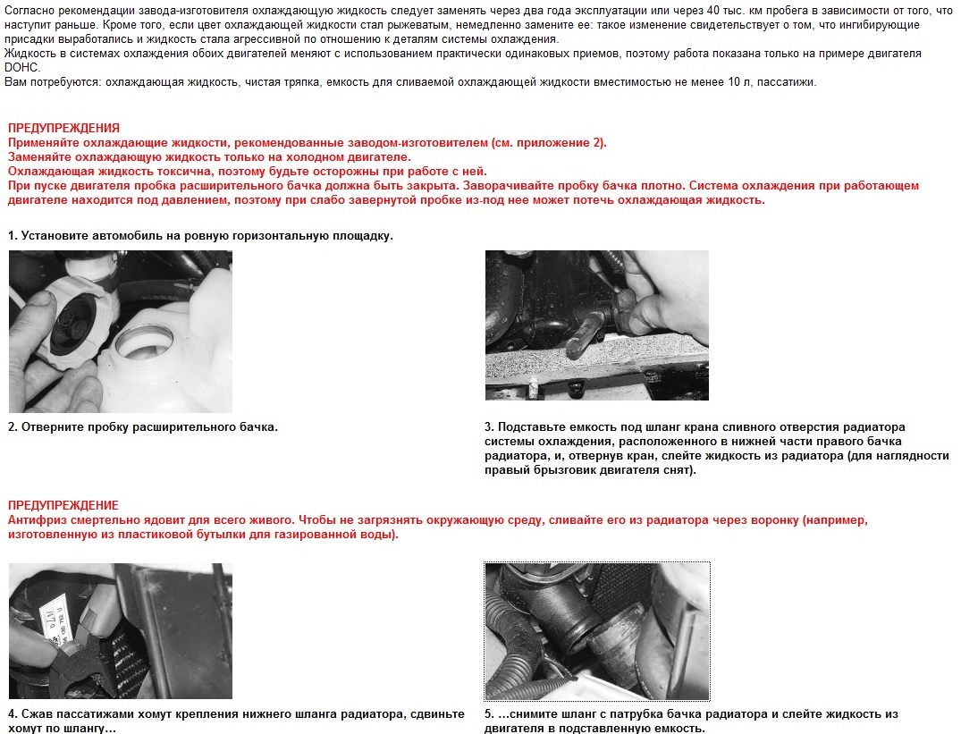 Не знаю, у меня нормально сливалось через кран в радиаторе, патрубки снимать особого смысла нет, у меня оттуда ничего не вытекло. Рекомендую также снять шланг подогрева дроссельного узла (рис. 2 от Анатолия), у меня после этого еще около литра вытекло. Потом, чтоб не волноваться за температуру замерзания, купил антифриз-концентрат -80, влил его полностью и до уровня долил водой.