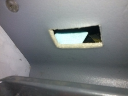 Про провода и всё остальное особо и писать нечего. Запитывался от подсветки прикуривателя, провода замечательно прячутся под ковёр. И вот, что вышло: кнопка как раз встала в отверстие.