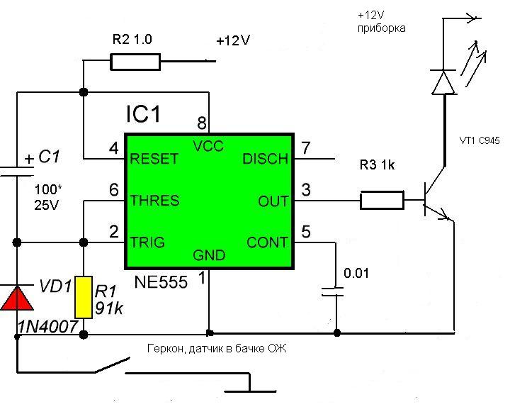 Продолжение поста датчик нижнего уровня ОЖ Т.к. было выявлено, что при повороте направо (при вывороте руля направо и движение машины и полном бачке по уровень жидкости), ОЖ перемещается в левую сторону бачка и кратковременно загорается индикатор ОЖ. Что бы это исключить, поставил схему таймера на 10 сек. Если в течении 10 сек. поплавок будет на нижнем уровне, то индикатор малого уровня ОЖ сработает. Сама схема с минимум деталей. Нажмите для просмотра прикрепленного файла В термоусадке. Нажмите для просмотра прикрепленного файла
