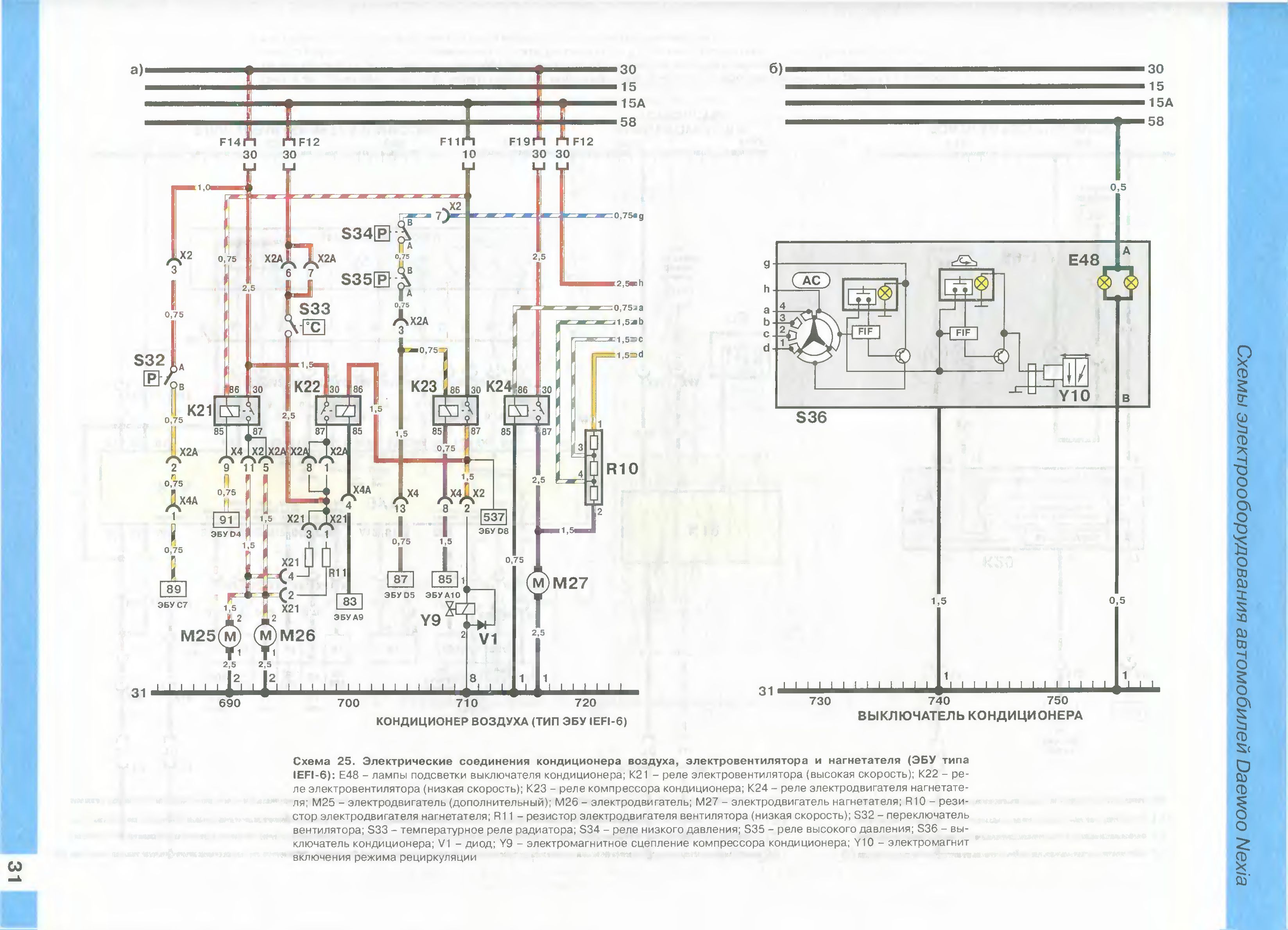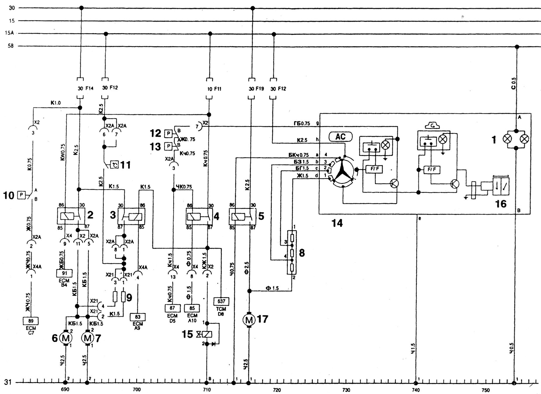 Прозвонку цепей к ЭБУ провести на разъемах Х4 и Х4А под бардачком (на включение реле компрессора, низкой скорости вентиляторов, сигнал включения с блока отопителя, сигнал включения вентиляторов с датчика установленного на компрессоре).