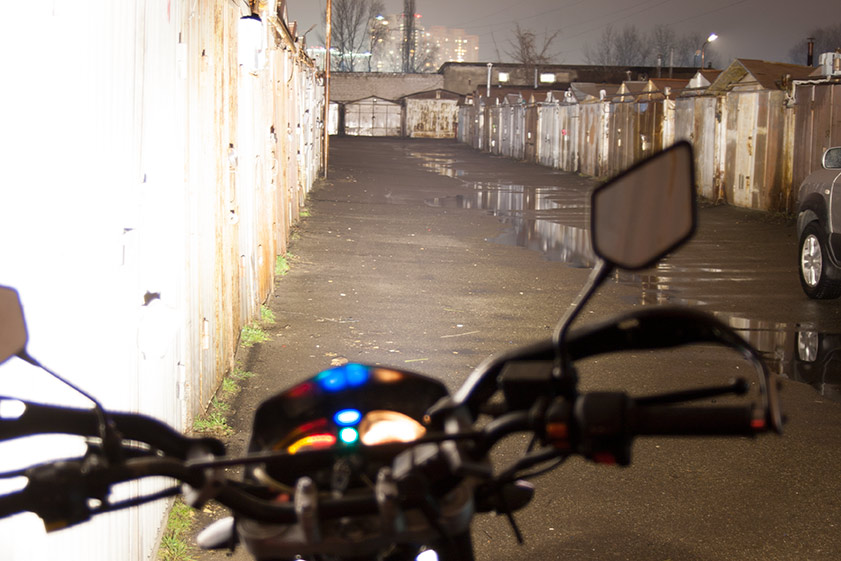 Фотка при первом включении, нибейте )) Потом я фару пересадил на кронштейны (сделал спецом) с углубленной регулировкой угла, и опустил луч так чтобы не слепил встречку. Потом смотрел снова со встречки, уже нормально, глаза не выедает. Но светит зачотно. Пока китаезный вентилятор китайезного радиатора работает, конечно )