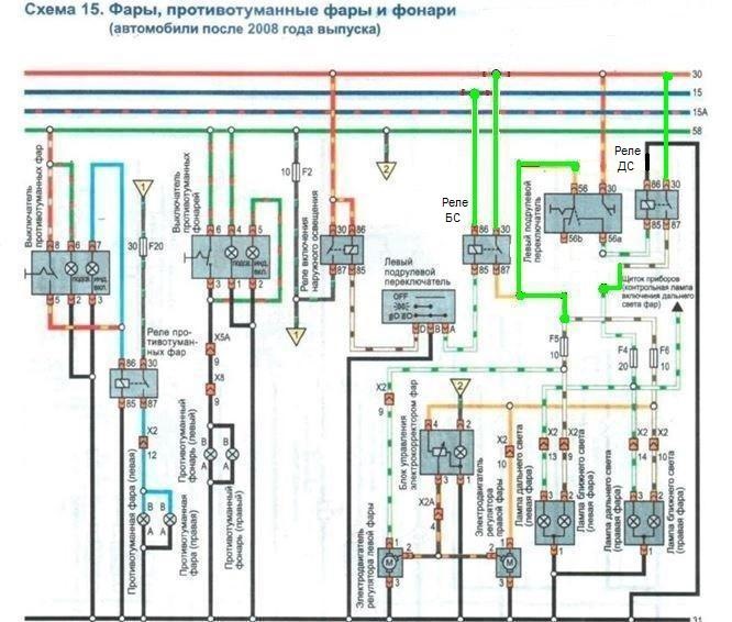 А то как то с завода по не нормальному все подключено. Нужно это устранить. Т.б. подрулевой уже будет без нагрузки и это важно, КГ тоже, т.к. провод силовых контактов будет браться прямо с АКБ (можно взять возле замка зажигания или на предохранительном блоке. А управление с 15 шины. При выкл. зажигания — фары будут гаснуть, что тоже важно.