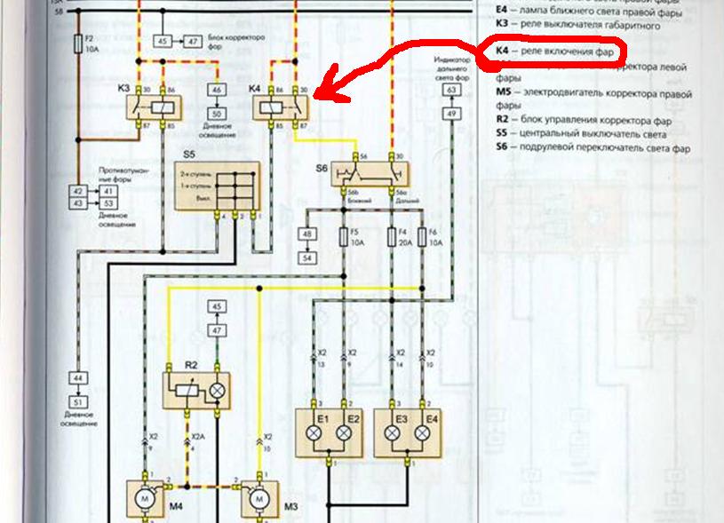 реле фар у нас есть, НО, оно только то и всего включается от замка зажигания, дальше после реле подается на контакты подрулевого выключателя, через которые при замыкании идет НАПРЯМУЮ к лампам фар через предохранители 10 ампер F5 (ближний) и F6 (дальний).