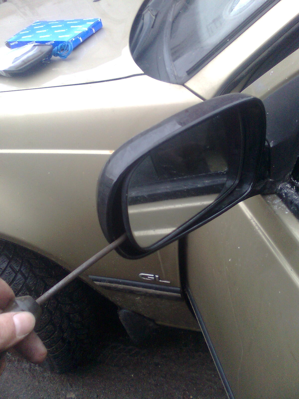 Поддеваем отверткой старое стекло и потихоньку отсоединяем его от зеркала