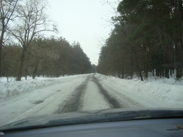 ) село Троещина-Летки-Остер. По Киевской дорога без снега, а дальше 16км - 57 минут - 17л/100км.
